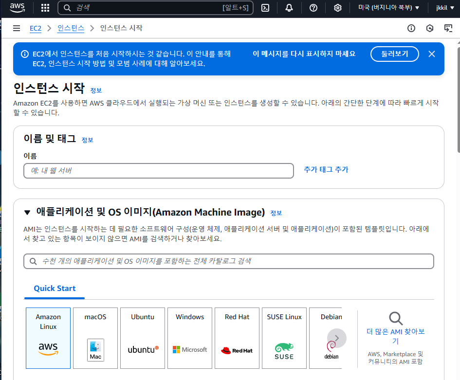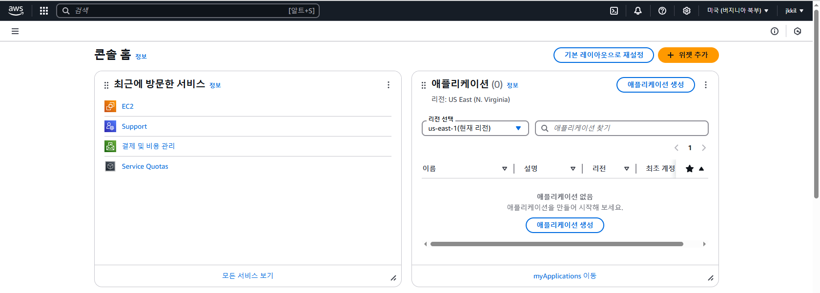 - 리전을 미국(버지니아 북부)로 선택 후 EC2 대시보드 이동